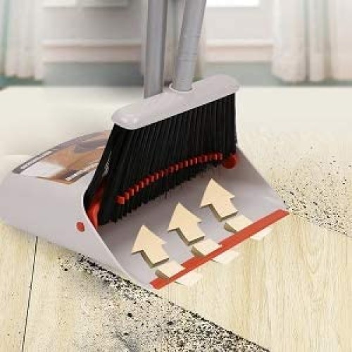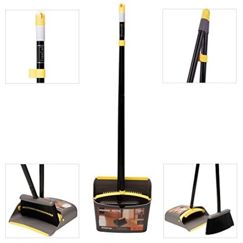 - ?Humanized Design on Dust Pan: Standing Dustpan locks in open position for easy emptying and features comb to comb out dirt and dust from broom bristles,The rubber lip of the dustpan is flush with the floor and the comb on Dust Pan clean out the bristles easily