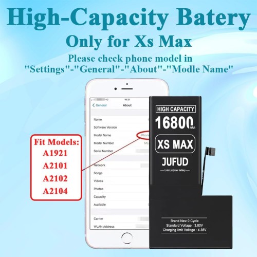 16800mAh Replacement Battery Used for iPhone Xs MAX, High-Capacity 0 Cycle Li-Polymer Battery - Compatible with Models A1921 A2101 A2102 A2104 Includes Full Repair Kit