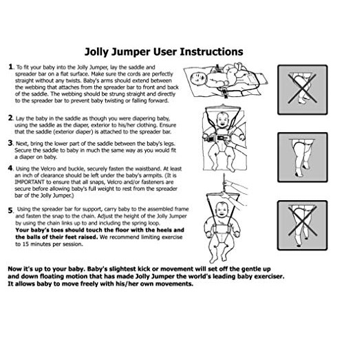 Watch as your baby bounces around and giggles in the Original Jolly Jumper with Stand. The scientifically designed saddle seat firmly supports baby's spine, ensuring correct, upright posture during exercise. Since 1948, Jolly Jumper has helped infants develop coordination, rhythm, strengthen muscles and improve balance. Can be used indoors or outdoors. Designed for babies from approximately 3 months of age (when baby can hold head up with full neck support) to just before walking age. Maximum weight of 28 lbs or 13 kg. The frame stands 52 inches high and has a floor footprint of 50 inches x 43 inches.